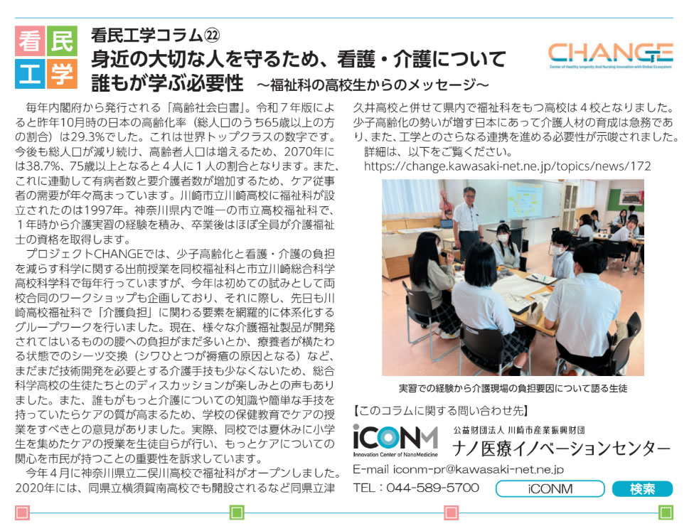 産業情報かわさき11月号が発行されました。奇数月のコラムは、看民工学コラム。 今回、プロジェクトCHANGEの活動の一環として川崎高校福祉科で少子高齢化に伴う看護・介護の負担軽減をテーマに行った出前授業の様子を紹介しています。