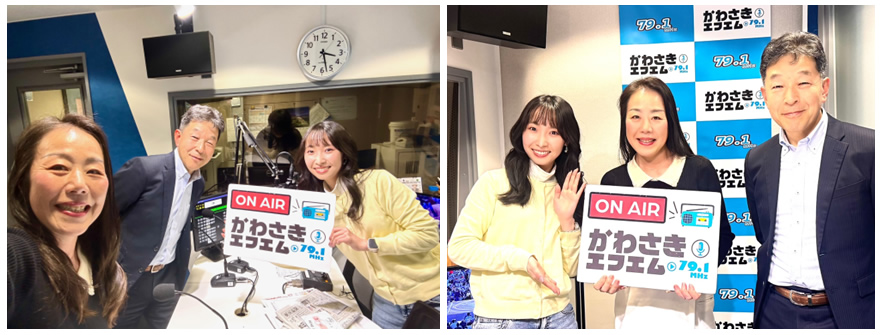 プロジェクトCHANGEの参画メンバーでもある「かわさき市民放送」が運営するラジオ局「かわさきFM」の新年恒例番組「声の年賀状」に、永井浩二・副センター長と横山美弥子・管理部スタッフが出演しました。「声の年賀状」は、川崎とゆかりのある方々が新春の挨拶を届ける番組です。スタジオは武蔵小杉駅の近くにあり、ガラス越しに放送の様子を拝見できる開放的な空間となっています。