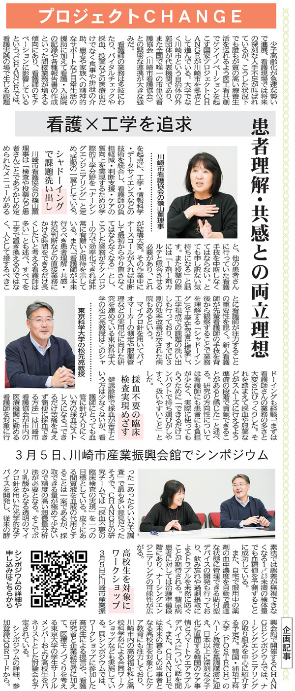 2月16日付化学工業日報に、プロジェクトCHANGEに関する企画記事が掲載されました。記事では、3月5日に開催予定のCHANGEシンポジウムのテーマにもなっている「ナーシングエンジニアリング」への期待について、川崎市看護協会の篠山薫理事がコメントしています。また、その具体的な施策については、東京科学大学教授であり、同プロジェクトで研究開発課題1リーダーを務める松元亮先生が語っています。