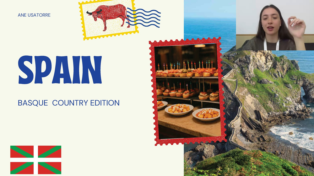 バスク地方はスペイン北部にあり、フランスとの国境付近に位置しています。この地域ではスペイン語のほかに、独自の言語である「バスク語」が話されています。バスク語はヨーロッパで最も古い言語のひとつとされており、他のどの言語とも系統的な関係が確認されていないと言われています。一方で興味深いことに、「ばかり→Bakarrik」「兄→Anai」など、日本語と意味や発音が似ている単語もあり、日本と何らかの関係があるのではないかという説も紹介されました。その後は、観光や食文化について、おすすめを紹介してもらいました。観光地としては、ドラマ『ゲーム・オブ・スローンズ』の撮影が行われた、海に浮かぶ教会などが挙げられました。料理については、チュレトン(大型のステーキ)、エントレコート、ピンチョス、バスクチーズケーキなど、日本でも親しまれているメニューが紹介されました。さらに、伝統的な衣装やスポーツについての話題に加え、自然豊かな地域であることについても触れられました。